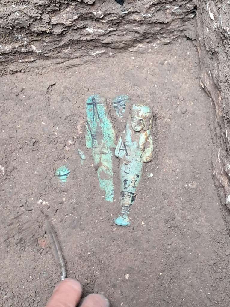 La mission française des fouilles de Tanis (EPHE-PSL), dirigée par Frédéric Payraudeau (Sorbonne Université, vice-président de la SFE) et Ahmed Nakshara (Ayn Shams University), a annoncé fin 2025 une importante découverte dans la nécropole royale de San el-Hagar, déjà connue pour les trésors qui y ont été trouvés en 1939. Dans une salle de la tombe du roi Osorkon II (XXIIème dynastie, vers 850 avant J.-C.), près d’un sarcophage anonyme pillé depuis longtemps, l’équipe a trouvé un dépôt de 225 statuettes funéraires en faïence. Elles portent le nom de Chéchonq III, successeur d’Osorkon II.