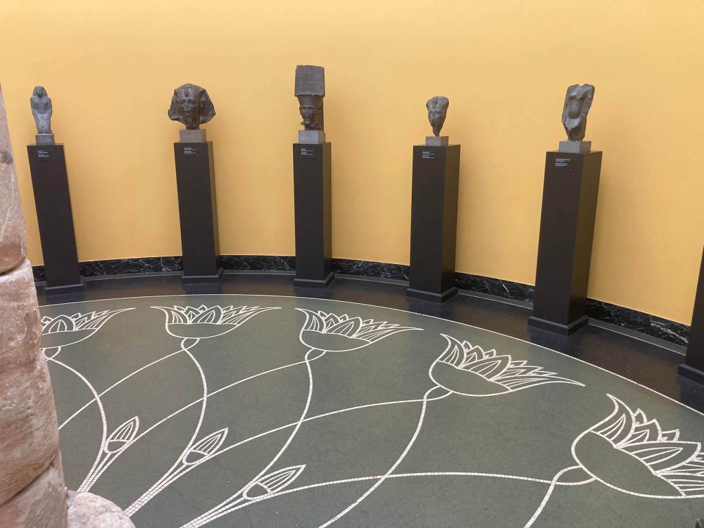 Plus loin apparaît une tête fragmentaire du roi Khéphren, avant que le visiteur ne pénètre dans une salle circulaire consacrée aux têtes royales et divines. On y remarquera notamment une sublime tête d’Amenemhat III en grauwacke.