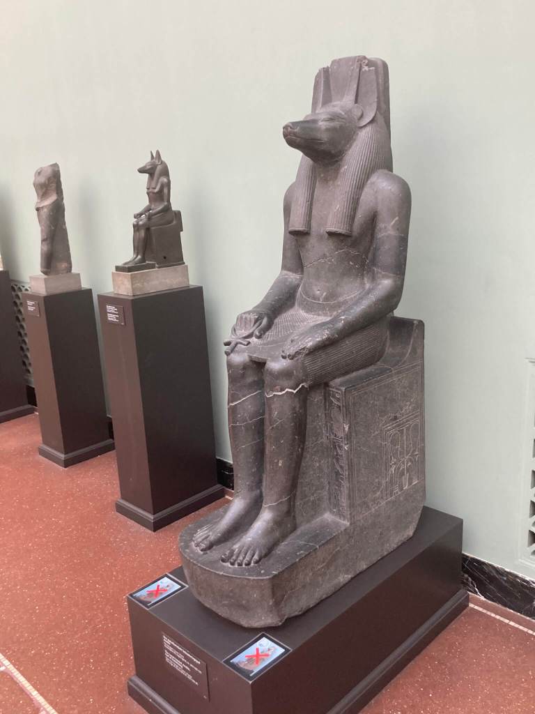 La collection compte aussi plusieurs œuvres d’une grande force symbolique : une représentation d’Anubis assis (grandeur nature), le groupe colossal réunissant Ramsès II et le dieu Ptah, ou encore une émouvante tête brisée de Sekhmet.