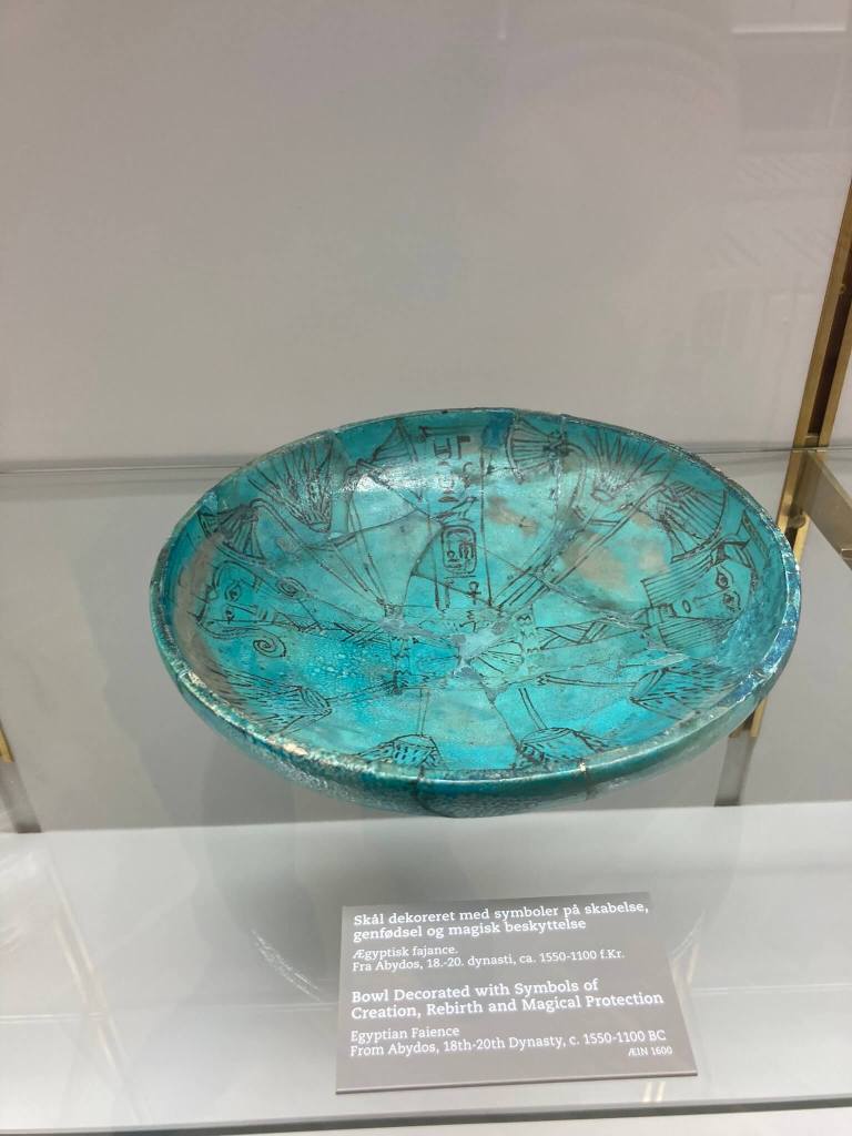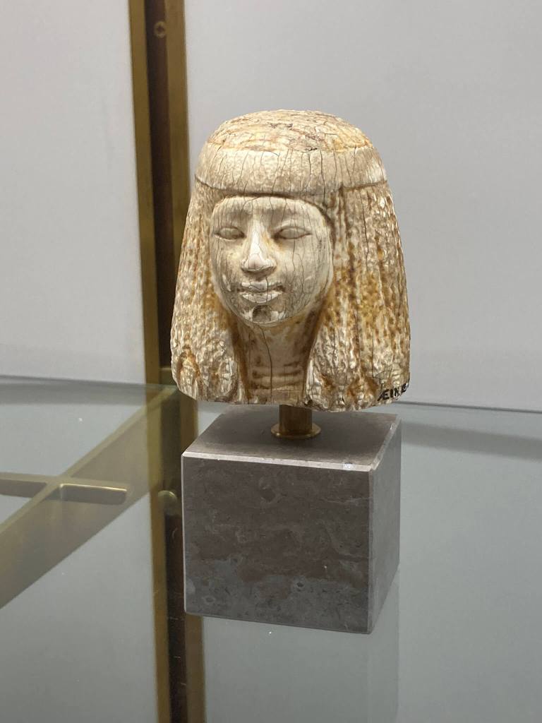 D’autres pièces, plus modestes mais tout aussi fascinantes, méritent également l’attention : une stèle dédiée par un certain Ipi au taureau Mnévis, provenant d’Héliopolis ; une tête de femme en ivoire d’une grande finesse ; un petit pot en ivoire figurant une Thouéris à tête humaine (XVIIIe dynastie) ; ou encore un plat en faïence bleue décoré de motifs hathoriques, provenant d’Abydos.