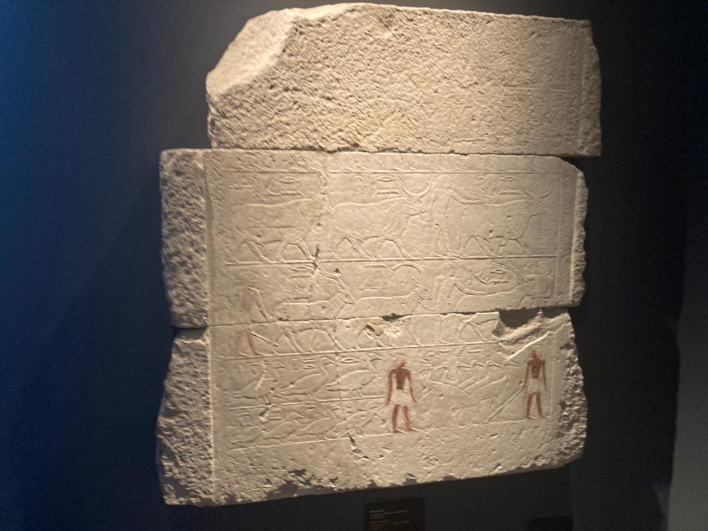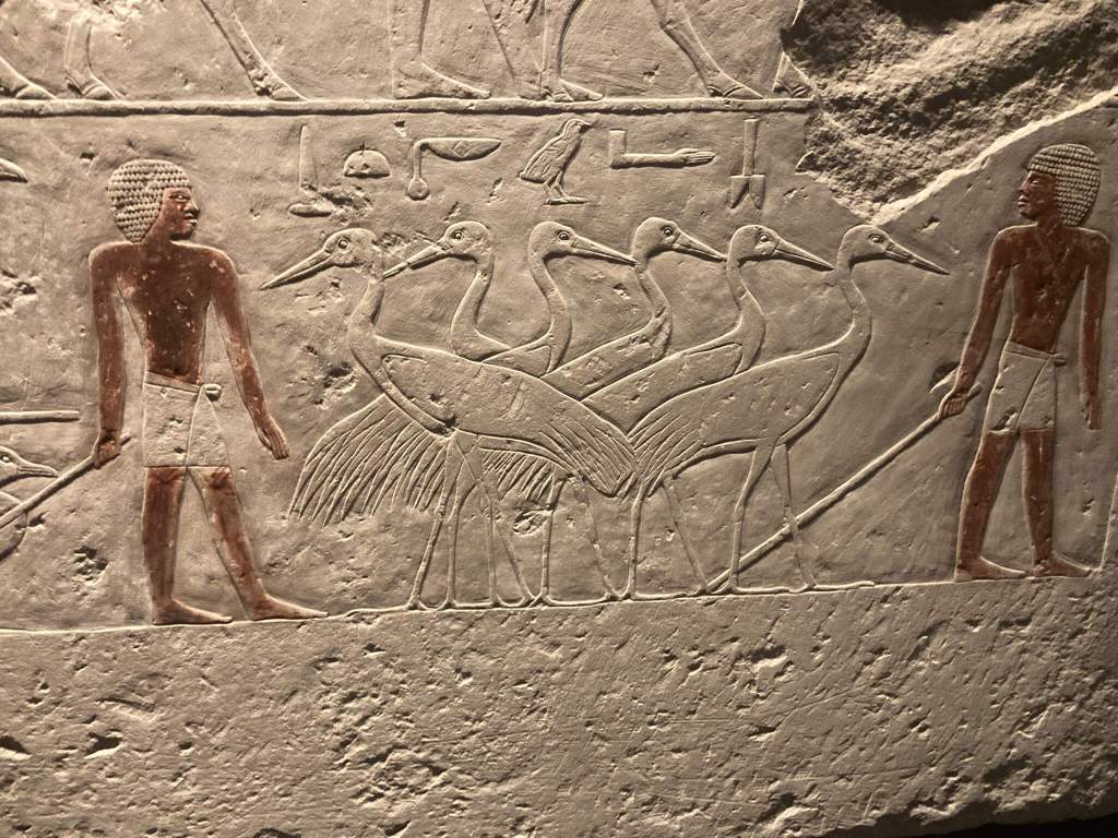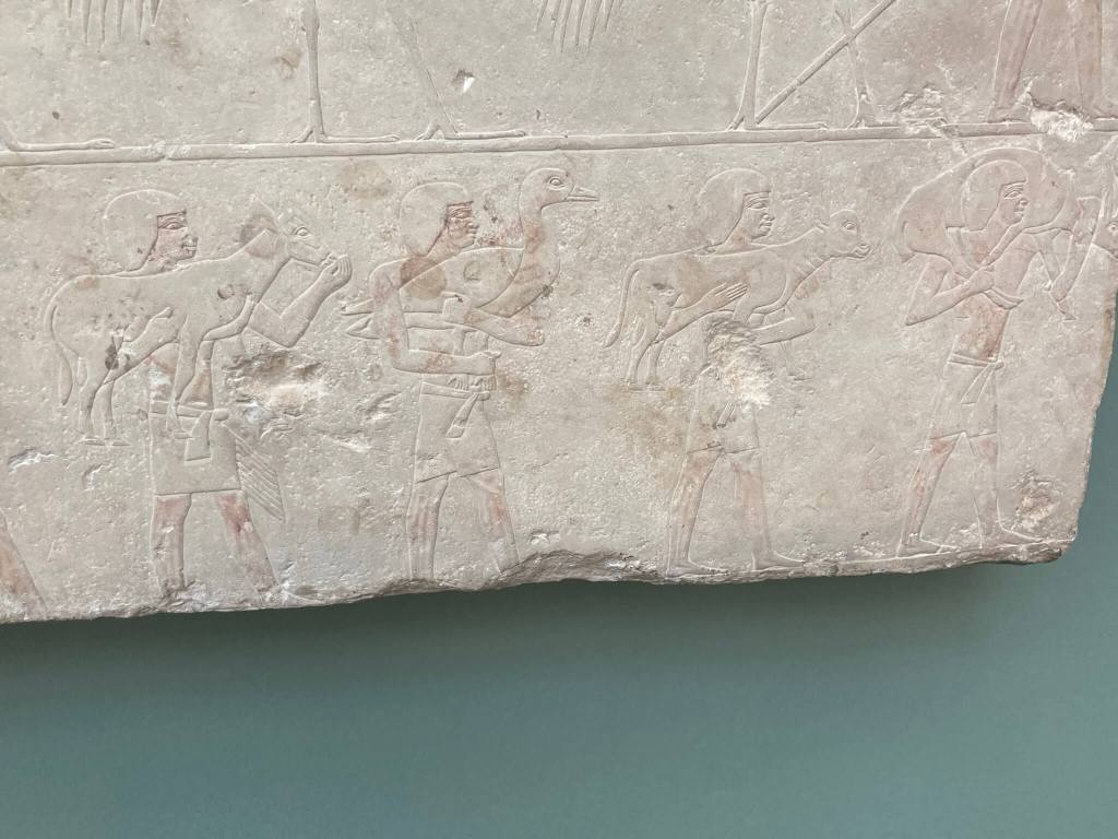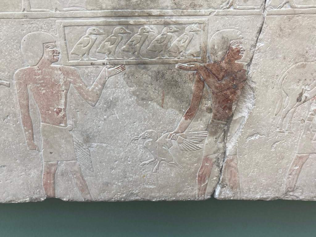On découvre d’abord plusieurs bas-reliefs issus de tombes de l’Ancien Empire, aux scènes simples et touchantes : le chargement d’un âne par deux paysans, une procession de porteurs d’offrandes, le transport d’une caisse emplie de canetons, ou encore la capture de canards au filet, dans un relief entièrement incrusté de pierres de couleur.
