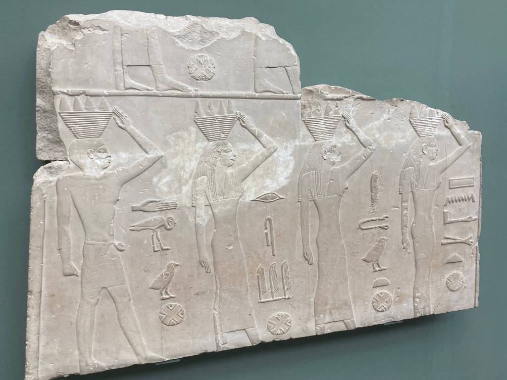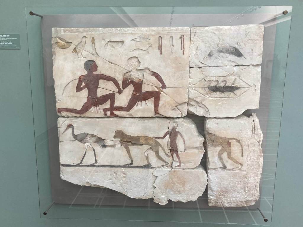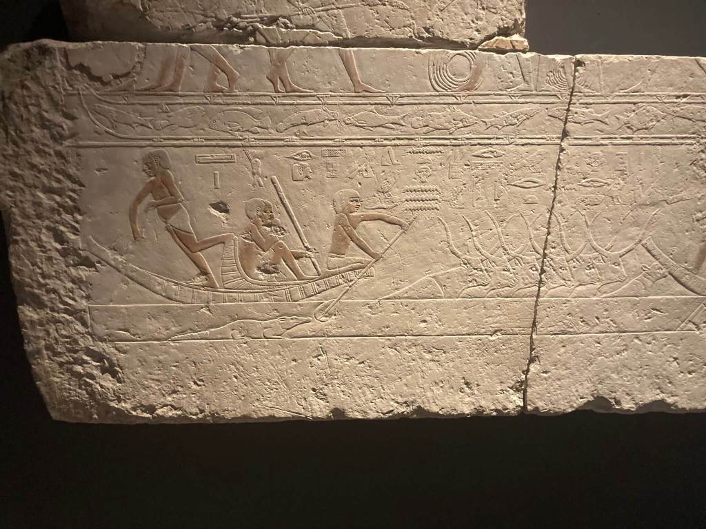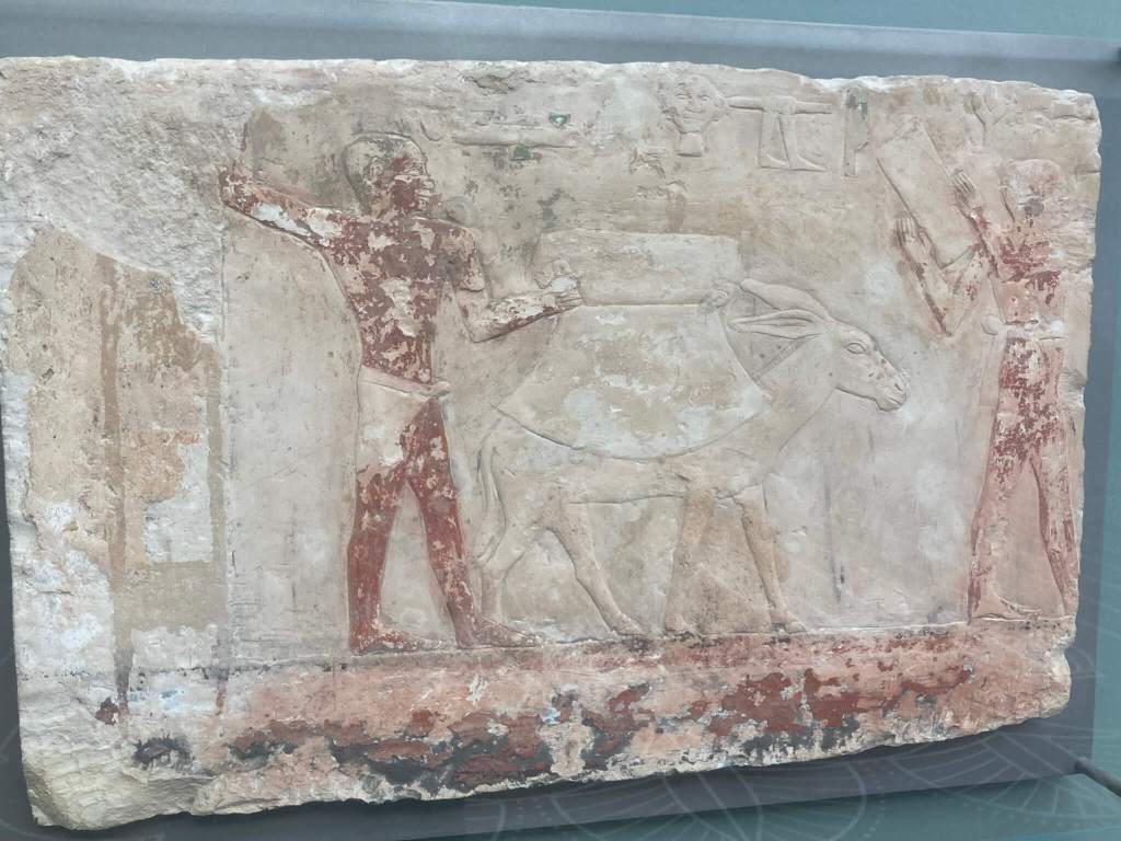 On découvre d’abord plusieurs bas-reliefs issus de tombes de l’Ancien Empire, aux scènes simples et touchantes : le chargement d’un âne par deux paysans, une procession de porteurs d’offrandes, le transport d’une caisse emplie de canetons, ou encore la capture de canards au filet, dans un relief entièrement incrusté de pierres de couleur.