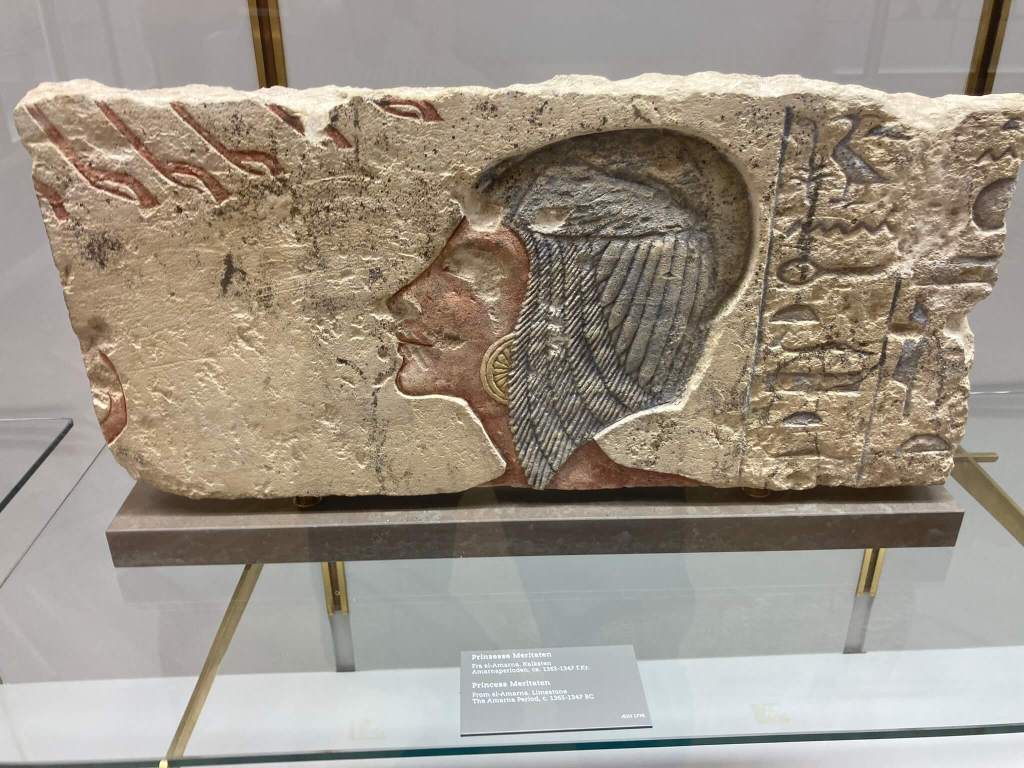 Parmi les reliefs, l’une des pièces les plus spectaculaires est sans doute une talatate amarnienne montrant le visage de la princesse Méritaton levé vers les rayons d’Aton. L’œuvre est d’autant plus intéressante que le crâne rasé initial de la princesse a été ultérieurement transformé en perruque royale, probablement ornée d’un uraeus.