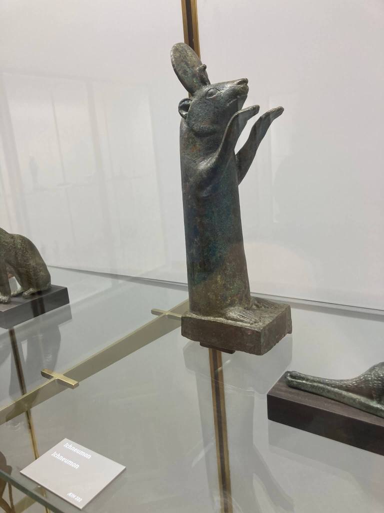 La visite peut se conclure par une stèle « à oreilles » en calcaire provenant du temple de Ptah à Memphis (XVIIIe dynastie), ainsi que par un charmant petit ichneumon en bronze, coiffé d’un disque solaire et représenté en position d’adoration.